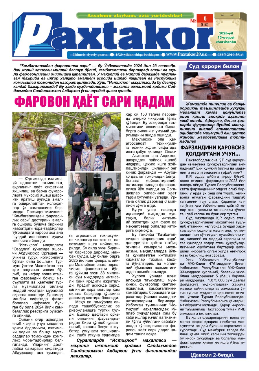 «PAXTAKOR» GAZETASINING 2025 YIL 6-SONIDA 13.08.2025 154 Улашинг: Рукн: Жамият и Маънавият Ўхшаш хабарлар Жамият саҳифасидаги мақолалар »«PAXTAKOR» GAZETASINING 2025 YIL 7-SONIDA:«PAXTAKOR» GAZETASINING 2025 YIL 7-SONIDA:БЕКОР ДЕБ ҲИСОБЛАНСИНБЕКОР ДЕБ ҲИСОБЛАНСИНФаровон ҳаёт сари қадамФаровон ҳаёт сари қадамЎЗБЕКИСТОН ЁШЛАРИ – БИРЛАШАЙЛИКЎЗБЕКИСТОН ЁШЛАРИ – БИРЛАШАЙЛИКЎхшаш хабарлар Маънавият саҳифасидаги мақолалар »Ism – inson hayotidagi birinchi ne’mat«PAXTAKOR» GAZETASINING 2025 YIL 1-SONIDA«PAXTAKOR» GAZETASINING 2025 YIL 1-SONIDAИжод саҳифаси«PAXTAKOR»NING 2024 YIL 9-SONIDA«PAXTAKOR»NING 2024 YIL 9-SONIDA