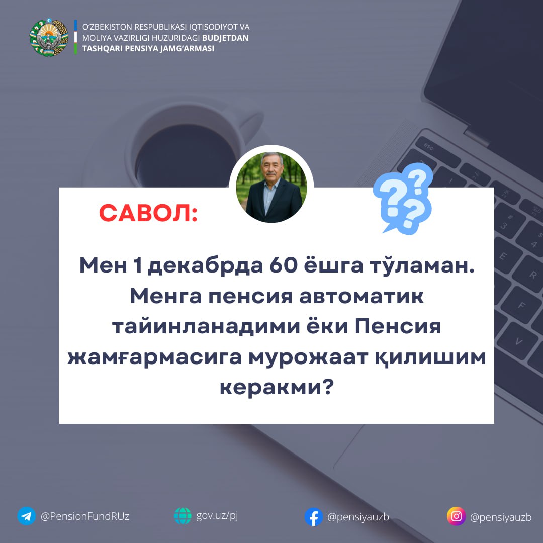 👉 На русском языке (https://www.instagram.com/p/DQ-9EPSCn9R/)Мен 1 декабрда 60 ёшга тўламан. Менга пенсия автоматик тайинланадими ёки Пенсия жамғармасига мурожаат қилишим керакми?